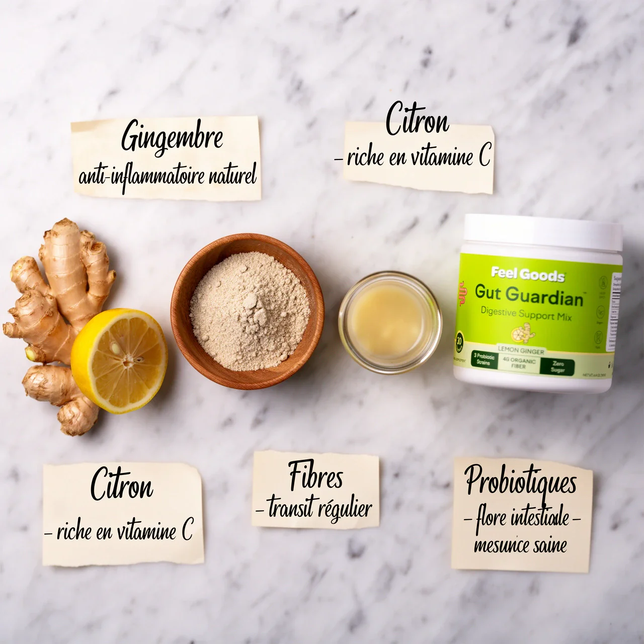 Une formule unique qui combine 3 souches probiotiques cliniquement étudiées, 4g de fibres organiques et des extraits de plantes digestives. Sans sucre, sans OGM, vegan et keto-compatible. Un seul geste chaque matin pour tout changer.