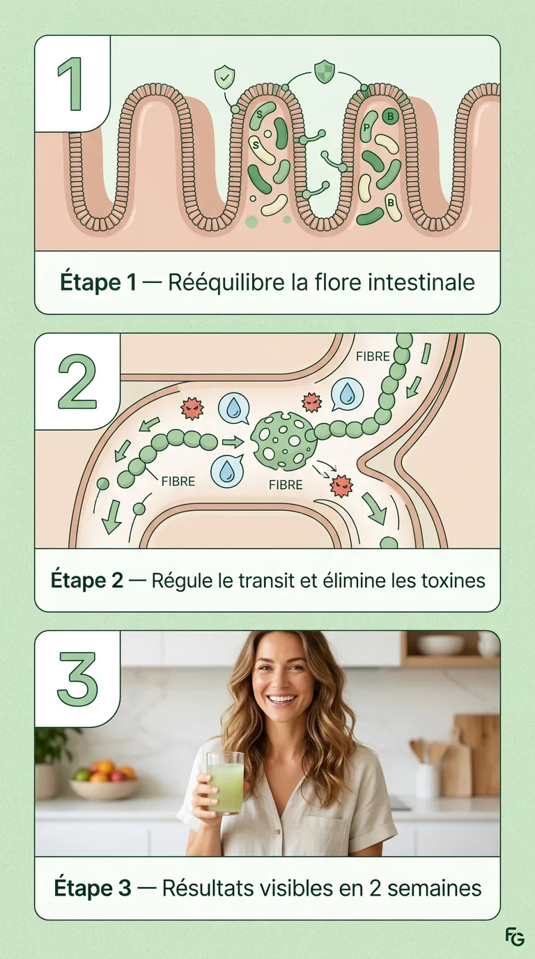 Son action est progressive et cumulative. Dès les premiers jours, votre confort digestif s’améliore. En deux semaines, votre flore intestinale est rééquilibrée. Au bout d’un mois, les résultats sont durables et visibles sur tout votre bien-être.