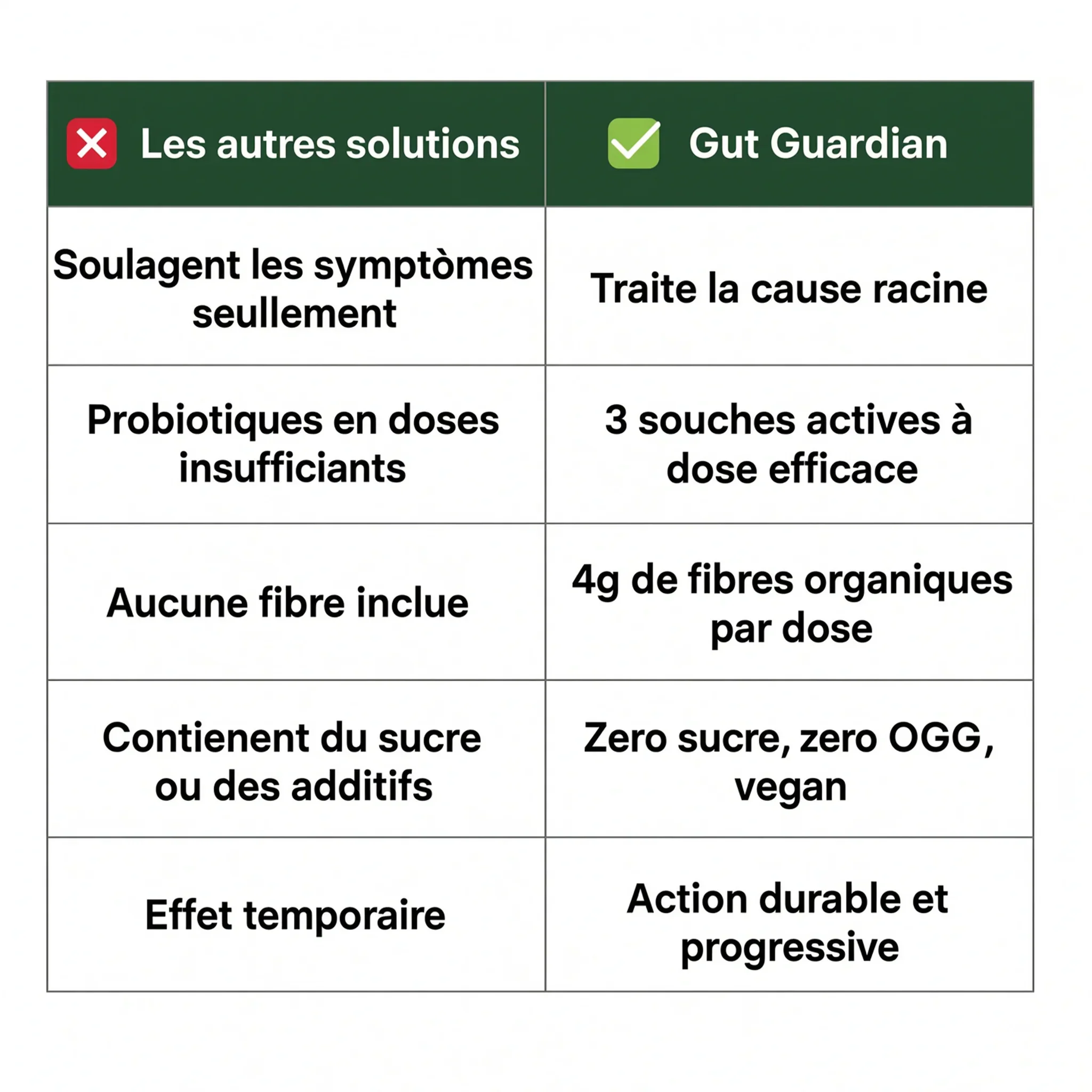 Les médicaments contre les ballonnements soulagent temporairement sans jamais traiter la cause. Les yaourts du commerce contiennent des doses de probiotiques trop faibles pour être efficaces. Les compléments classiques négligent les fibres et les plantes. Gut Guardian est la seule formule qui réunit tout ce dont votre intestin a besoin — en une seule dose simple, chaque matin.