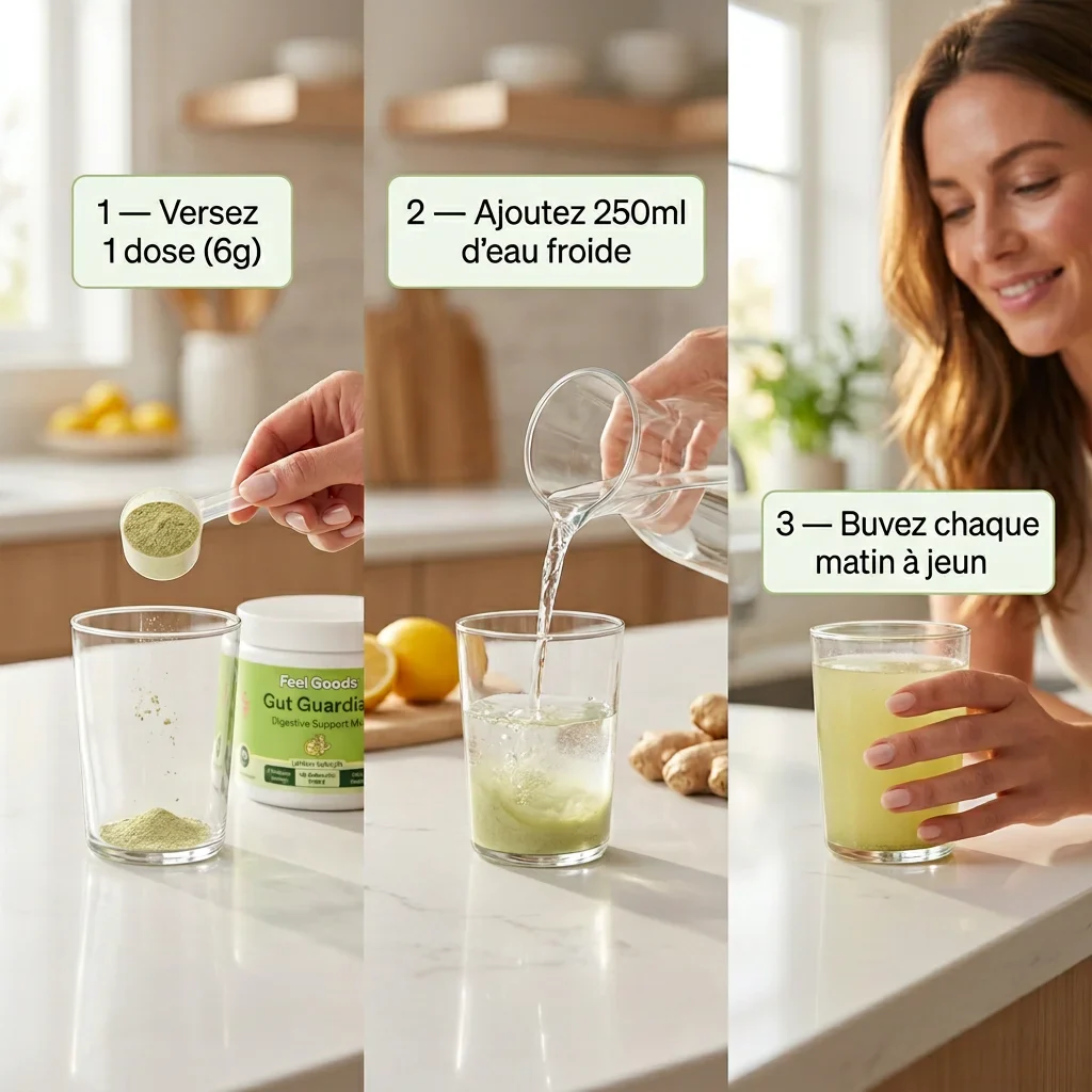 Pas de pilules, pas de préparation compliquée. Gut Guardian se dissout en quelques secondes dans un verre d’eau, de jus ou de lait végétal. Une seule dose chaque matin, et votre intestin vous remerciera.